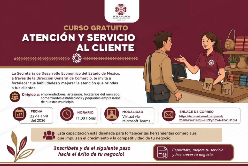 La Secretaría de Desarrollo Económico del Estado de México, a través de la Dirección General de Comercio, invita a emprendedores, artesanos, locatarios de mercados, comerciantes establecidos y pequeños empresarios a participar en el Curso Gratuito de Atención y Servicio al Cliente.