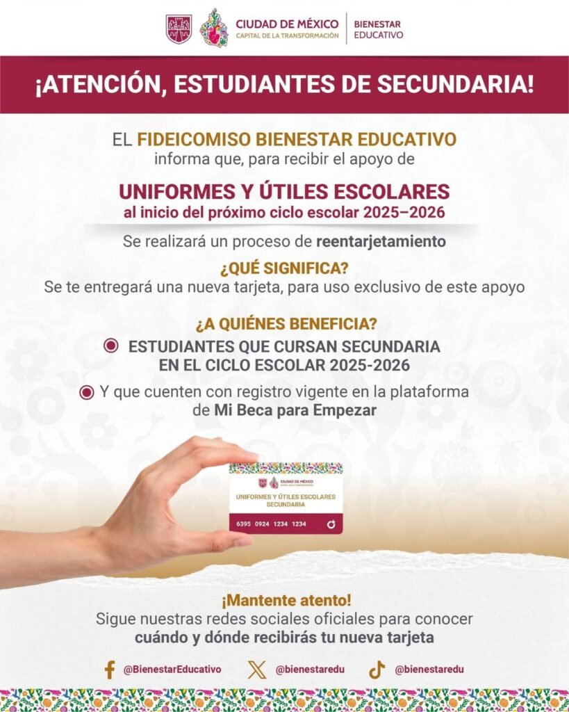 El Fideicomiso Bienestar Educativo informó que, como parte del programa de apoyo a estudiantes, se llevará a cabo un proceso de reentarjetamiento para quienes cursen secundaria en el ciclo escolar 2025–2026.