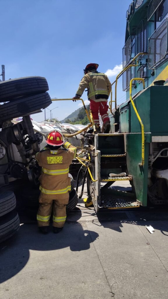 Elementos de Protección Civil y Bomberos atienden la volcadura de una pipa de hipoclorito de sodio vacía, que quiso ganarle el paso al tren en la Vía Morelos, en la colonia La Purísima Tulpetlac, sin que representen riesgo a los transeúntes y automovilistas.