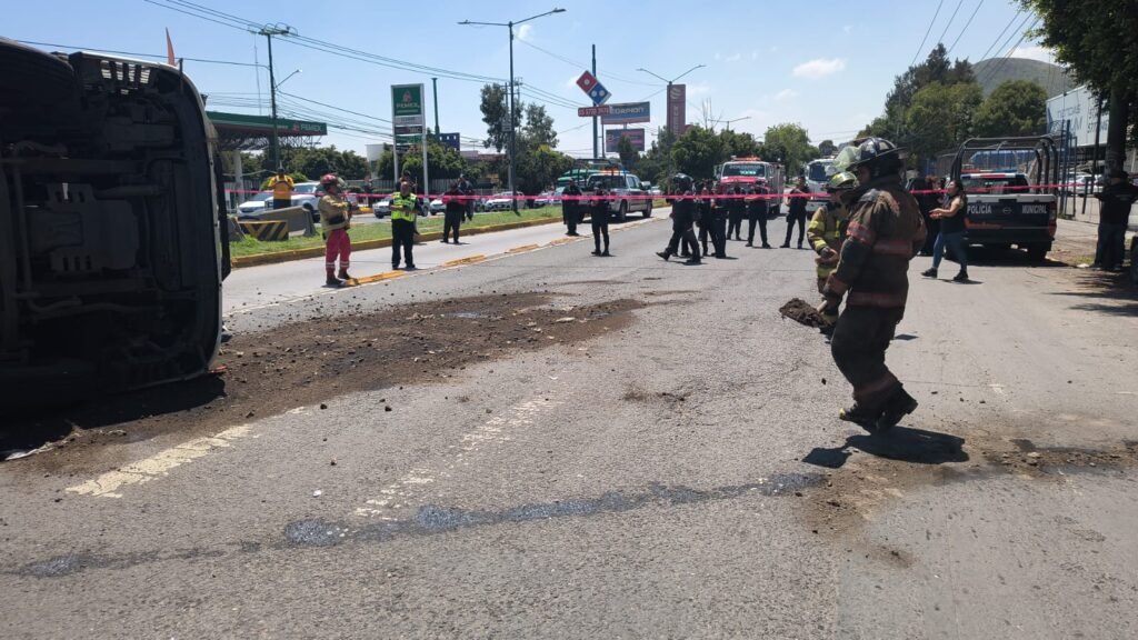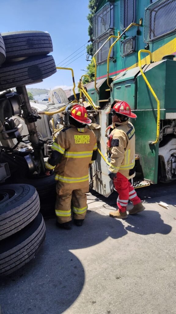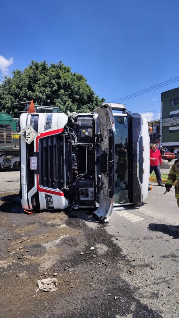 En el lugar laboran elementos de Bomberos, debido a que hubo derrame de diésel y aceite que es controlado con tierra; supervisaron el contenedor que no registró fisuras. En la zona se realizaron cortes viales debido a que se encuentran cerrados ambos sentidos de Vía Morelos pero ya se realizan maniobras con una grúa para poner en pie la unidad y liberar la vialidad.
