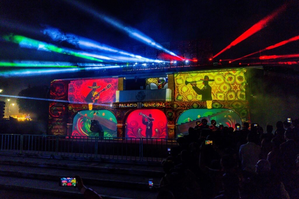 Previo al Grito de Independencia, los asistentes disfrutaron de un videomapping que iluminó la fachada del Palacio Municipal con imágenes alusivas a la historia de México.