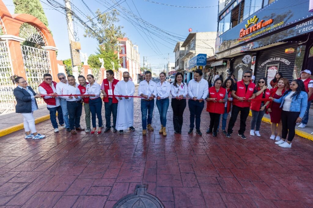 Al inaugurar la calle Independencia en el pueblo de San Lorenzo Tetlixtac, pavimentada con concreto hidráulico estampado y color, el presidente municipal David Sánchez Isidoro reafirmó el compromiso de su administración con el desarrollo urbano y la atención a los temas prioritarios.