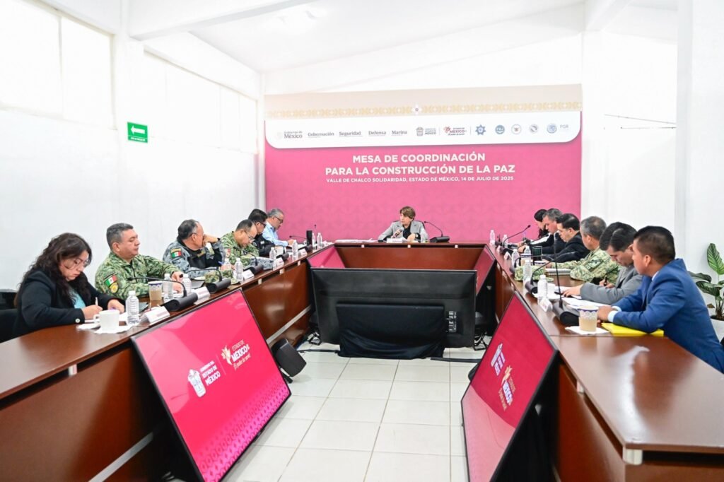 La Mesa de Coordinación para la Construcción de la Paz sesiona diariamente y de manera itinerante en todos los municipios de la entidad para evaluar indicadores, ajustar estrategias y reforzar la colaboración entre autoridades federales, estatales y municipales. “Con acciones coordinadas, trabajamos para la paz y la seguridad de las y los mexiquenses”, puntualizó la Gobernadora Delfina Gómez Álvarez.