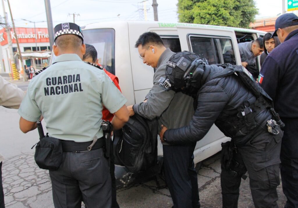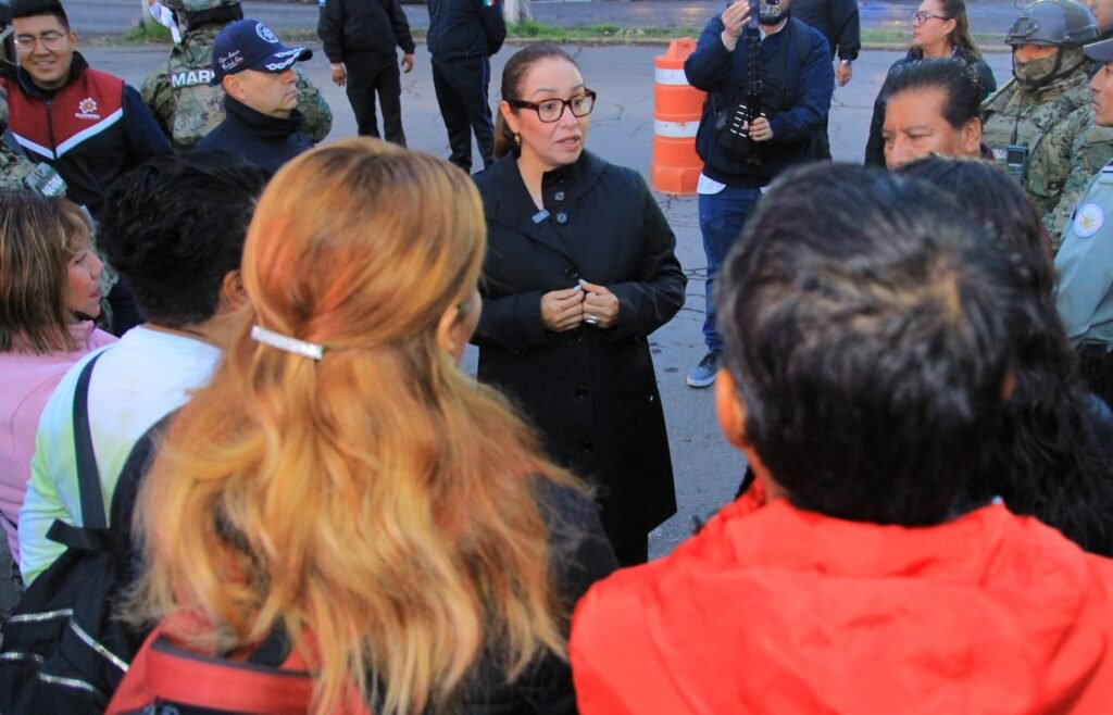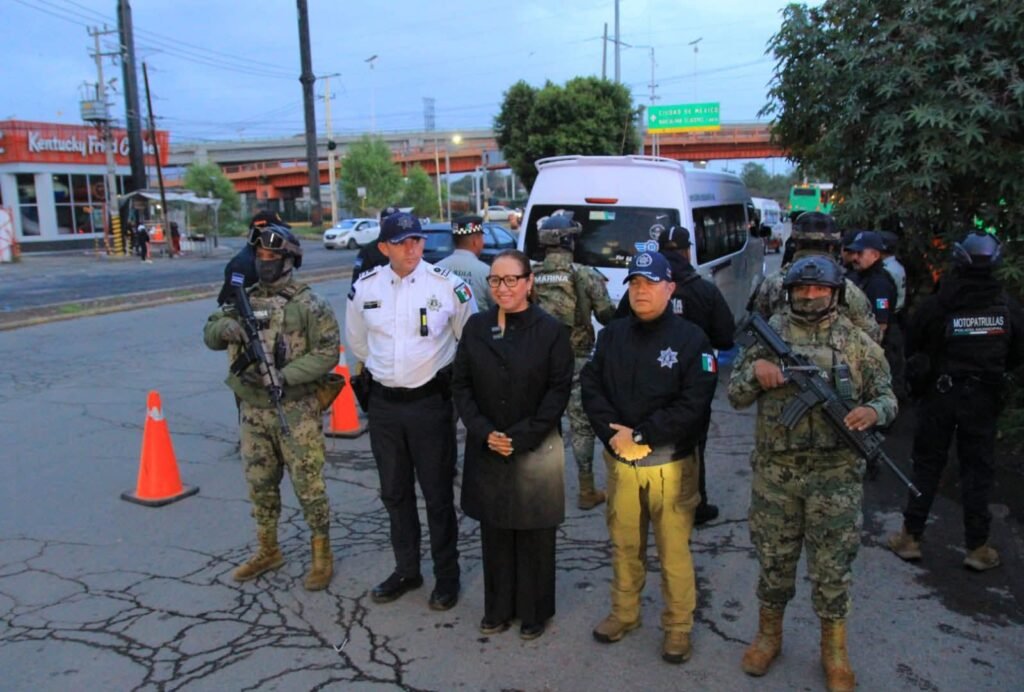 En avenida Jardines de Morelos, en el fraccionamiento del mismo nombre, la presidenta municipal supervisó el despliegue táctico de elementos municipales, policía de Género y Tránsito, Marina, Sedena y Guardia Nacional, quienes colocaron un filtro para detener unidades de transporte público, revisar a hombres y mujeres para detectar con apoyo de la Unidad Canina armas blancas o de fuego, además de prevenir agresiones a mujeres.
