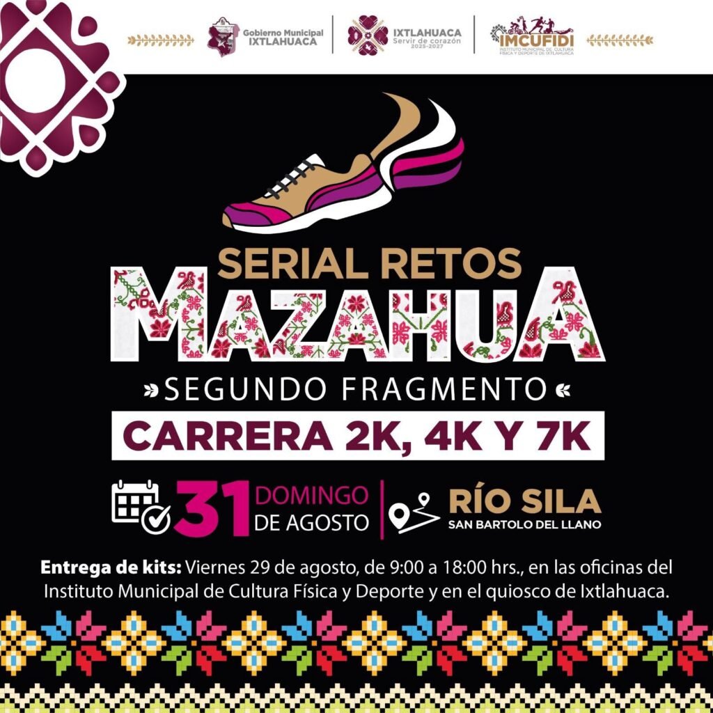 🎽 La entrega de kits será el viernes 29 de agosto, de 9:00 a 18:00 hrs, en las oficinas del Instituto Municipal de Cultura Física y Deporte y en el quiosco de Ixtlahuaca.
