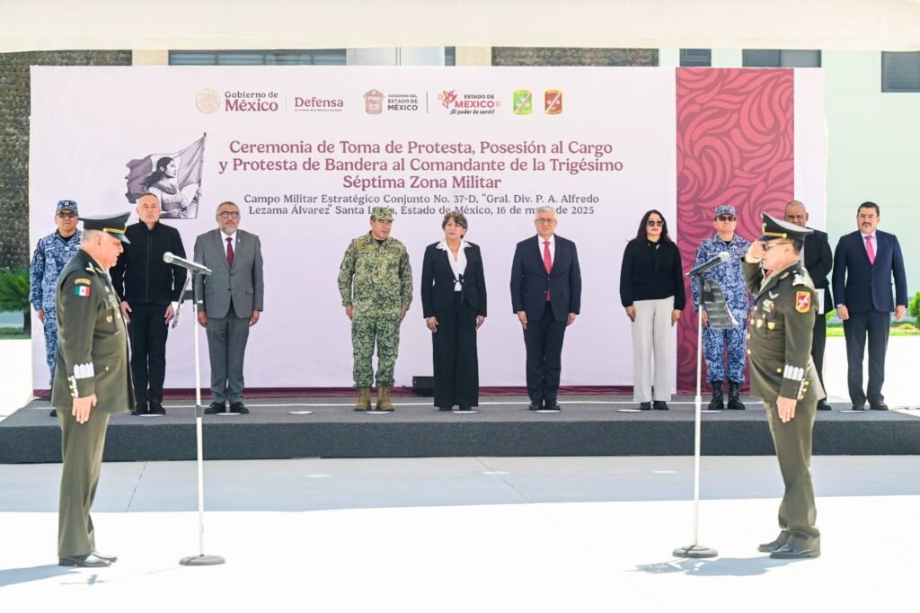 “Hoy asistí a la Ceremonia de Toma de Protesta, Posesión al Cargo y Protesta de Bandera del General de Brigada E.M. Lucio Vergara Gómez, como Comandante 37/a Zona Militar, a quien le deseo el mayor de los éxitos. Al darle la más cordial bienvenida al Estado de México, le reitero nuestra más amplia disposición de trabajo conjunto y corresponsabilidad institucional. #ElPoderDeServir” afirmó la Gobernadora Delfina Gómez Álvarez en sus redes sociales.