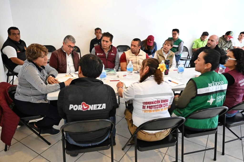 En reunión en el Centro de Mando de Protección Civil, la Maestra Delfina Gómez subrayó que, gracias a la coordinación entre los tres órdenes de gobierno, con el apoyo de Protección Civil estatal, CONAGUA, CAEM y autoridades municipales, ninguna familia tendrá que esperar para recibir apoyos, al tiempo que constató las acciones inmediatas de limpieza, saneamiento y levantamiento de censos para canalizar la ayuda de manera puntual.