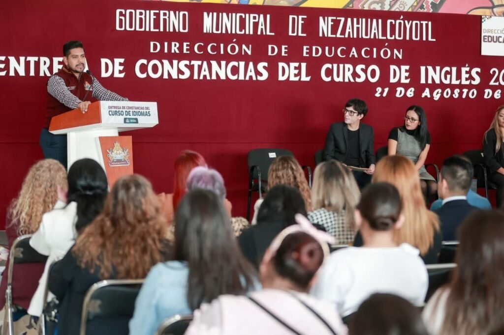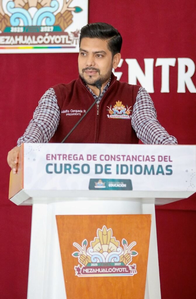 El presidente municipal de Nezahualcóyotl, Adolfo Cerqueda Rebollo, encabezó la entrega de las primeras constancias del Curso de Inglés 2025, a 65 estudiantes de la Escuela Municipal de Idiomas y anunció que se ampliará la oferta académica, incorporando italiano.