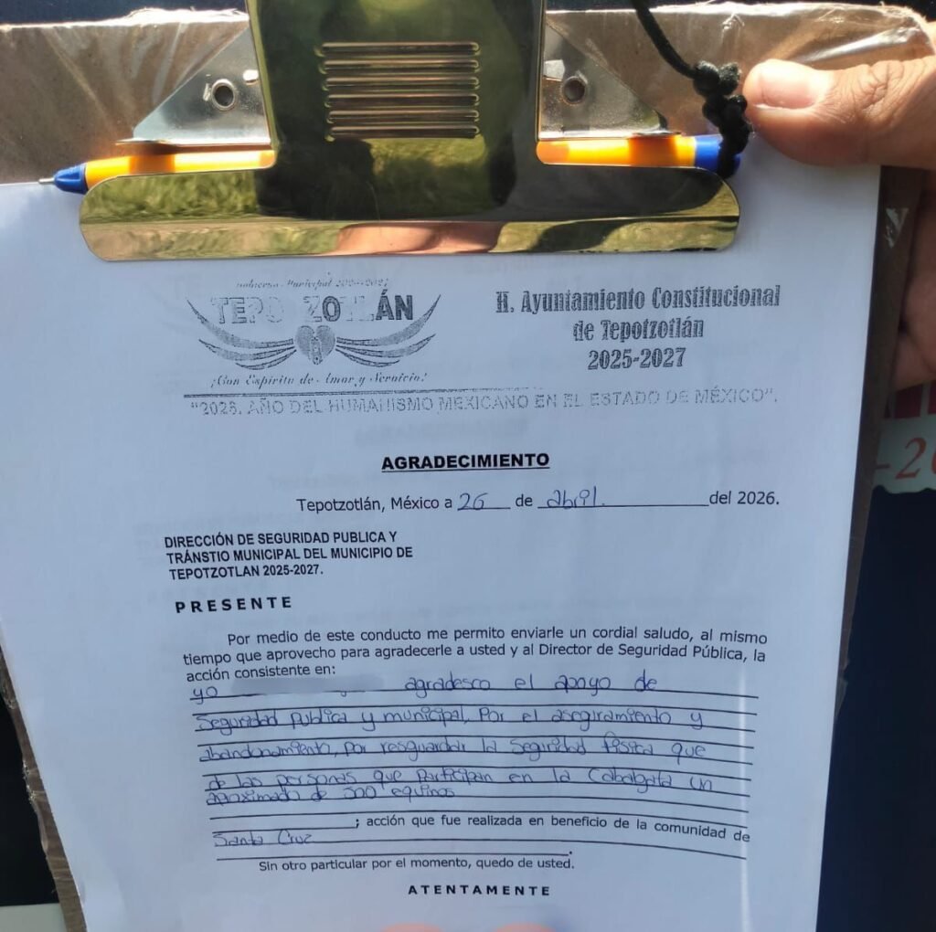 Es importante destacar que la Cabalgata se llevó a cabo con saldo blanco durante su desarrollo, gracias al trabajo coordinado y al resguardo de la Dirección de Seguridad Pública y Tránsito Municipal, labor que fue reconocida por los propios organizadores mediante un agradecimiento formal.