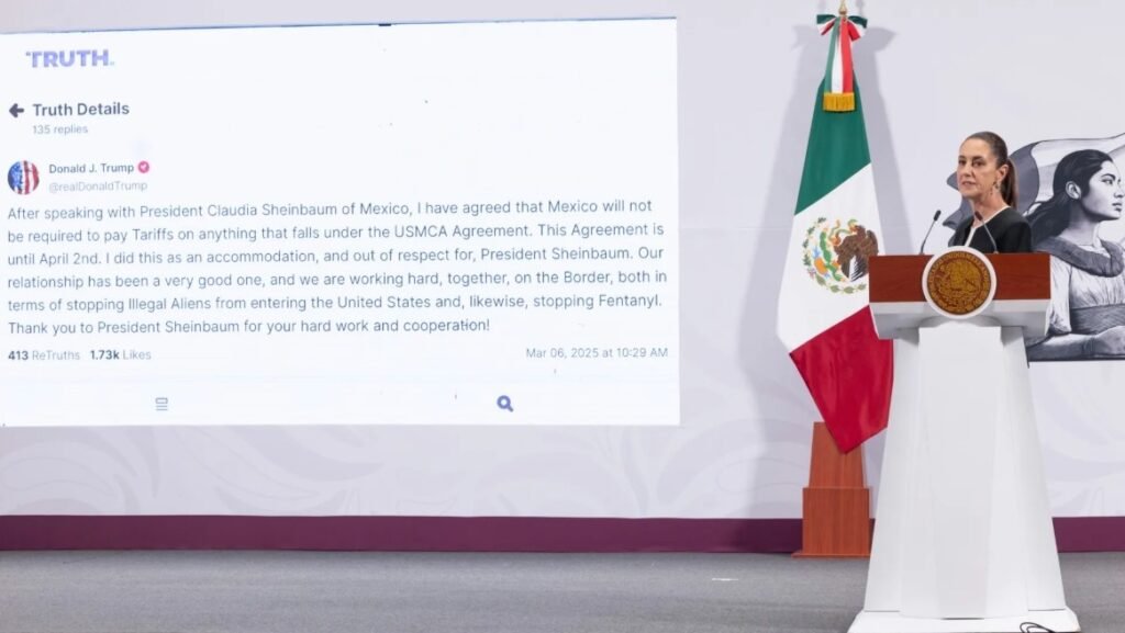 La presidenta Claudia Sheinbaum anunció que, tras una conversación con Donald Trump, se acordó postergar hasta el 2 de abril la aplicación de aranceles del 25 % a productos mexicanos exportados a Estados Unidos.