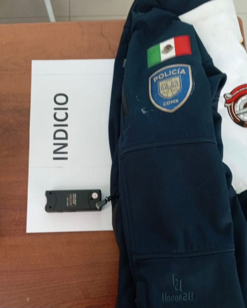 Al realizar la intervención hallaron en el interior del vehículo una camisola de la policía de la Ciudad de Mexico y un taser, pistola de descargas eléctricas, por lo que cuestionaron al conductor si era integrante de alguna corporación policial, lo cual negó.