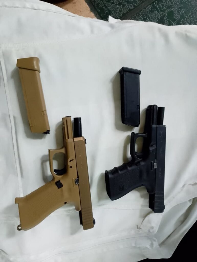 También portaban un arma tipo escuadra negra Glock 25 calibre .380 mm, con cargador y 13 cartuchos útiles; un arma tipo escuadra Glock 19x café; calibre 9 mm con cargador con 18 cartuchos útiles; dos chalecos tácticos con leyenda de la Fiscalía General de Justicia, un escudo y PDI, además de 12 teléfonos celulares y 46 mil pesos en efectivo.