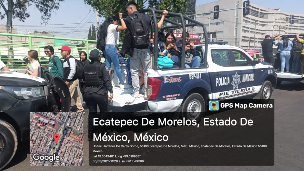 Elementos de Seguridad Ciudadana y Tránsito Municipal realizan el traslado de cientos de usuarios afectados por el bloqueo en ambos sentidos de las avenidas Central y R1, que provocó la suspensión del servicio del Mexibús Línea 1, debido a la protesta de padres de familia de la escuela primaria “Adolfo Ruiz Cortines”, en demanda de atención al deterioro de instalaciones del plantel por parte de autoridades estatales.