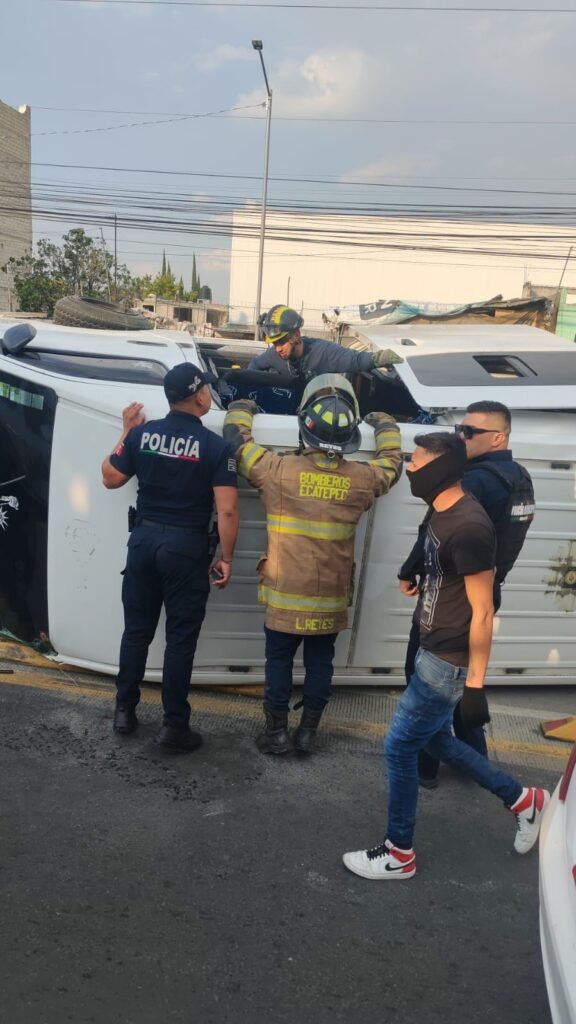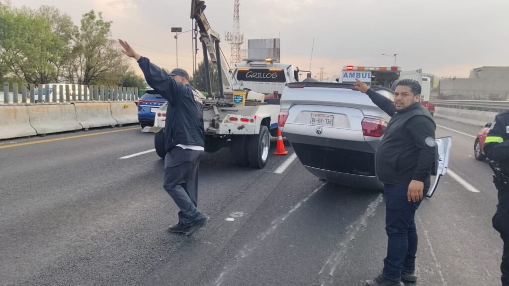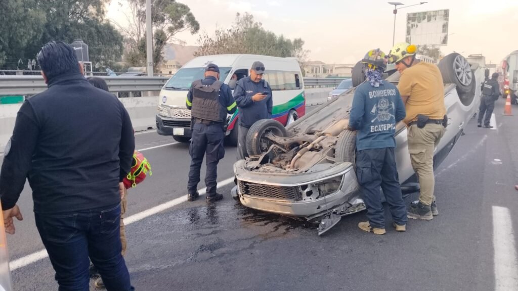 Adicionalmente, en otro punto en la autopista México-Pachuca, en el pueblo de Santa Clara Coatitla, se registró la volcadura de un vehículo Vento, color plata, con placas PEL-60-18, que quedó recostado sobre el toldo.