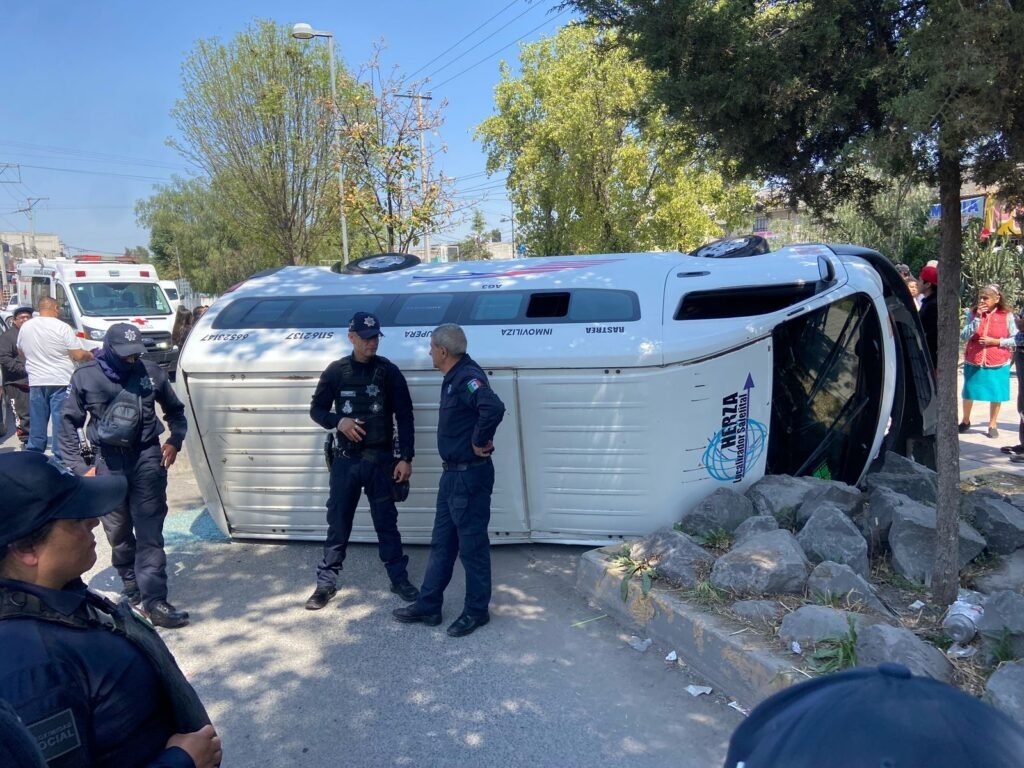 Elementos de la Dirección de Protección Civil y Bomberos de Ecatepec atendieron la volcadura de una camioneta del transporte público en avenida Recursos Hidráulicos, a la altura de la colonia Luis Donaldo Colosio, lo que dejó saldo de seis personas lesionadas, entre ellas dos menores de edad.