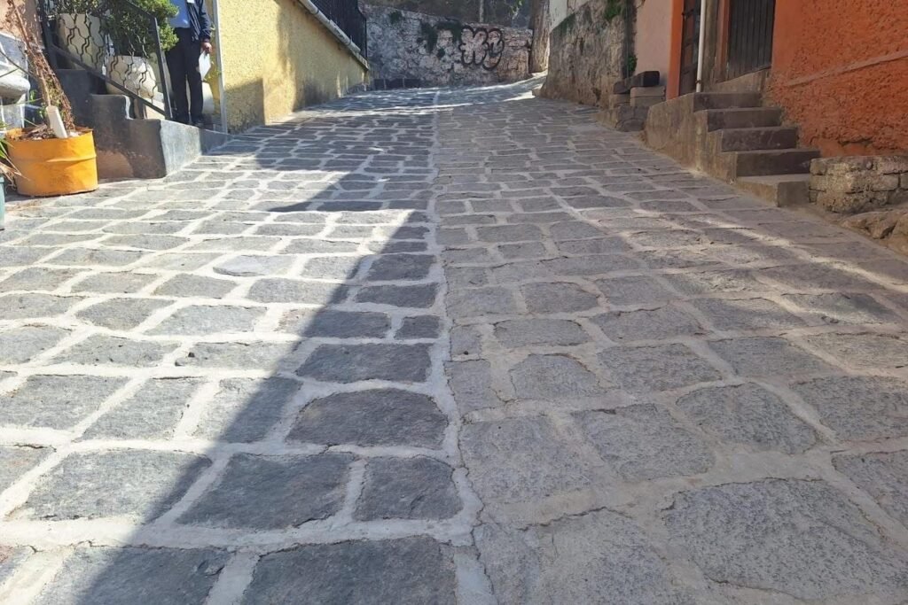 Como parte de los trabajos, se colocó material especializado que permite mantener y fortalecer las calles empedradas que distinguen a esta comunidad, respetando su identidad tradicional y al mismo tiempo mejorando su funcionalidad para el tránsito seguro.