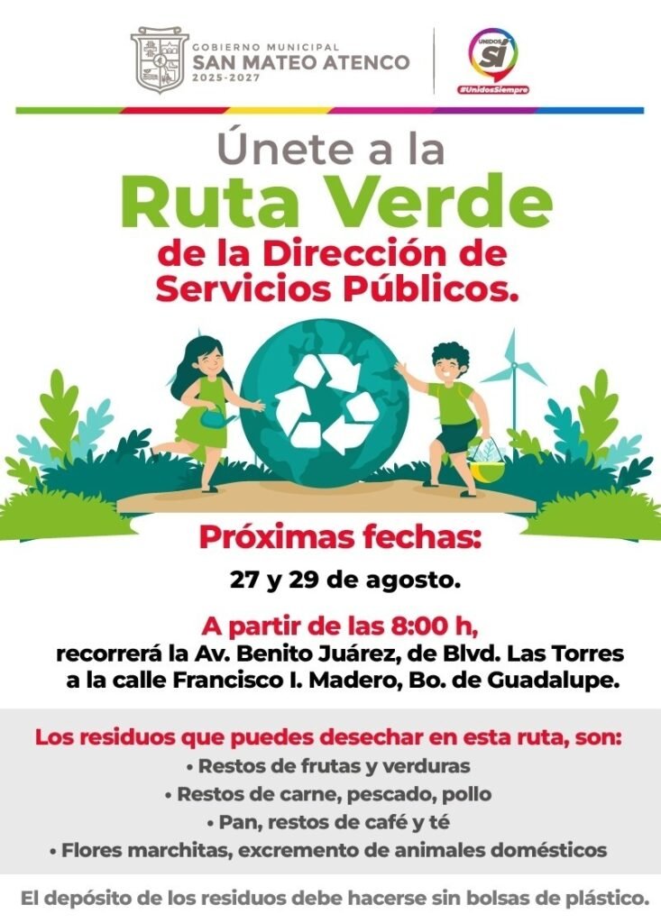 El Gobierno Municipal de San Mateo Atenco, administración 2025-2027, continúa promoviendo acciones sustentables a través de la Ruta Verde, una iniciativa de la Dirección de Servicios Públicos que busca fomentar el manejo adecuado de residuos orgánicos entre la ciudadanía.