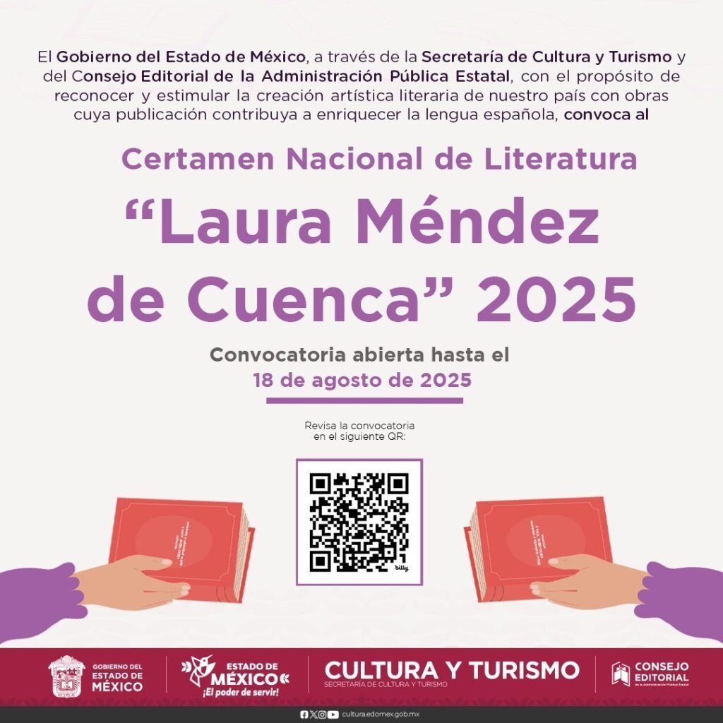Con la finalidad de reconocer el trabajo de escritores mexiquenses y dar oportunidad a nuevos autores publicando y difundiendo su trabajo, la Secretaría de Cultura y Turismo del Estado de México invita a participar en el Certamen Nacional Literario “Laura Méndez de Cuenca” 2025.